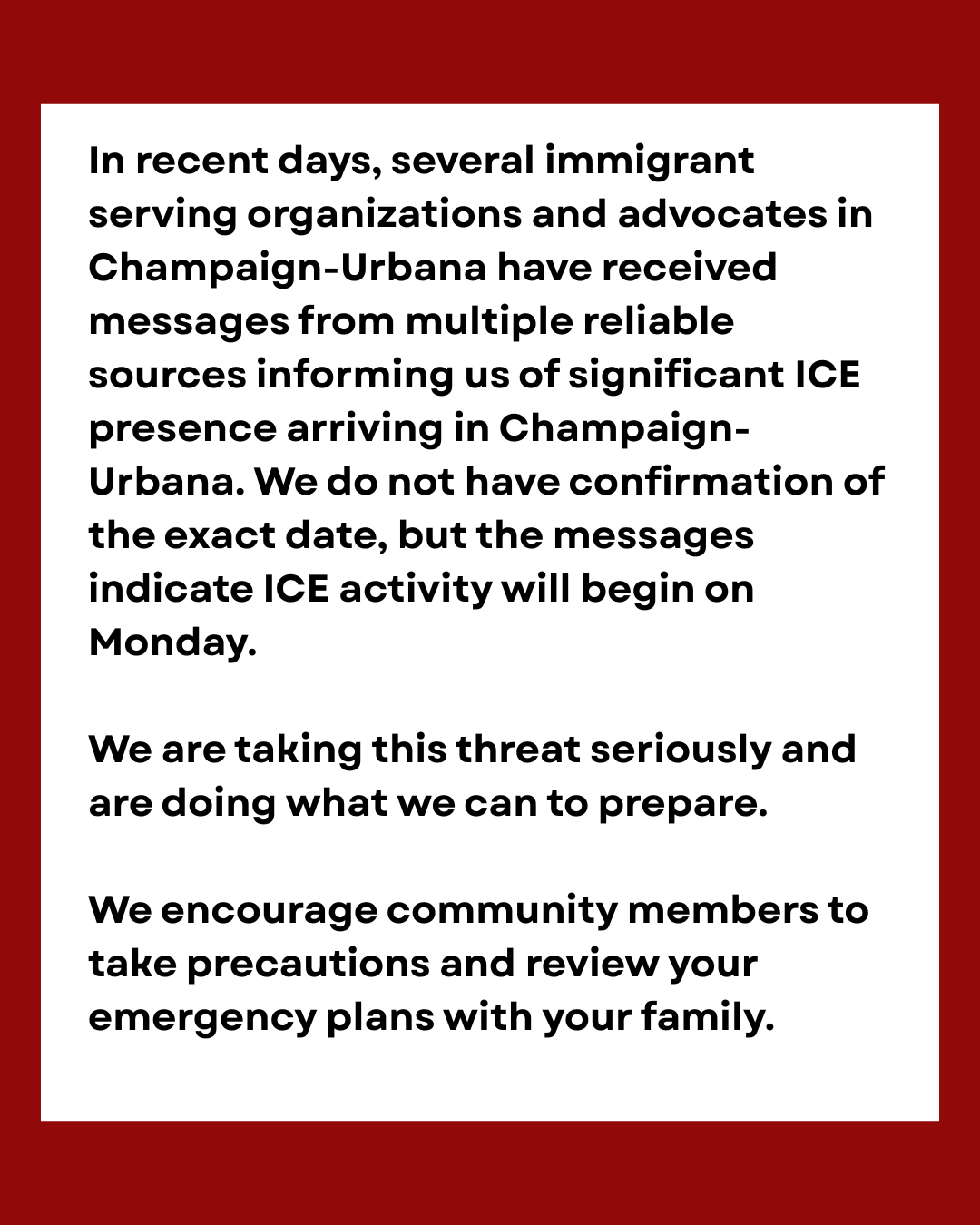 Image 1 ID: A read and white graphic. Text reads: In recent days, several immigrant serving organizations and advocates in Champaign-Urbana have received messages from multiple reliable sources informing us of significant ICE presence arriving in Champaign-Urbana. We do not have confirmation of the exact date, but the messages indicate ICE activity will begin on Monday (April twenty-seventh) We are taking this threat seriously and are doing what we can to prepare. We encourage community members to take precautions and review your emergency plans with your family.