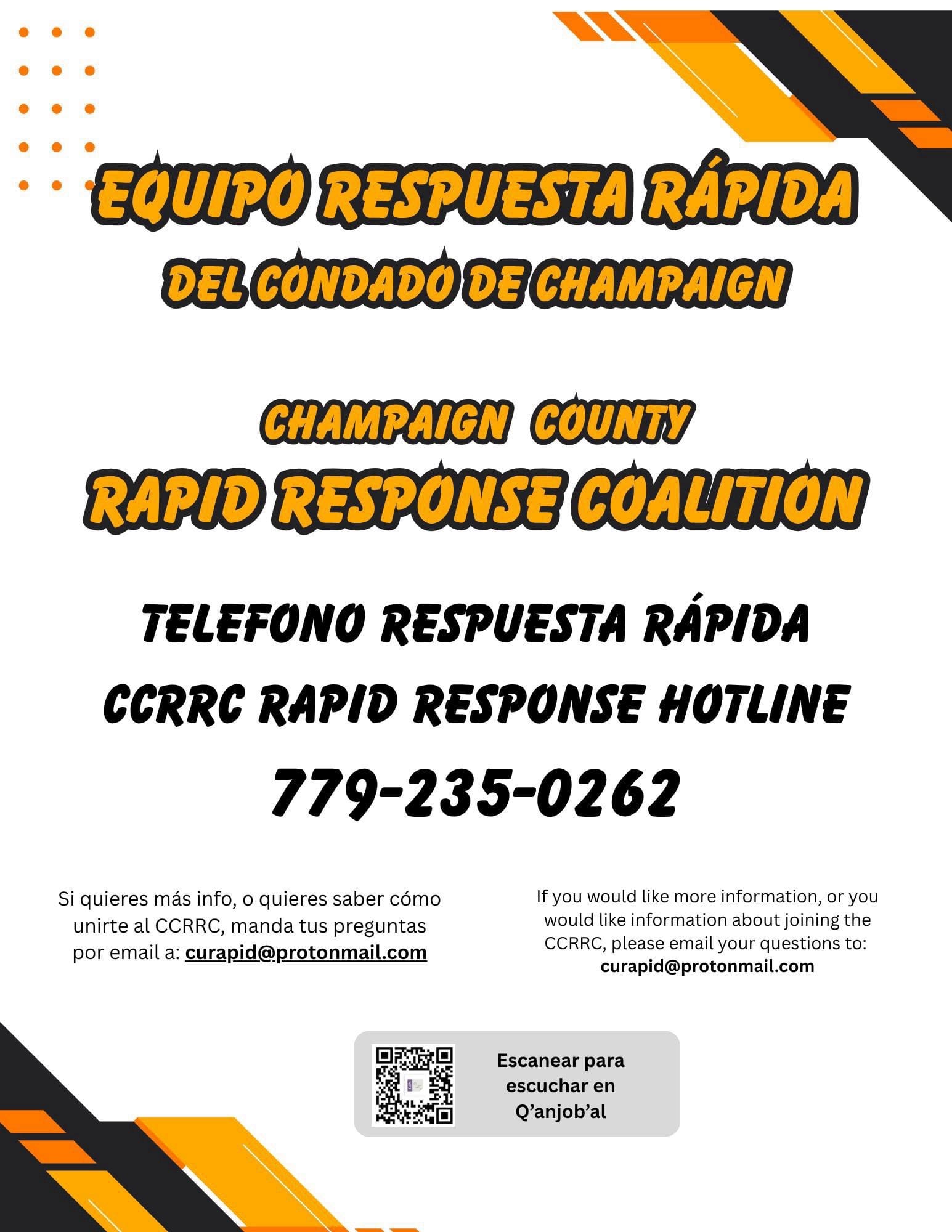Image 2 ID: A yellow and black graphic, with a QR code at the bottom. Scan the QR code for this message written in Q'anjob'al. Text reads: Equipo respuesta rapida del condado de Champaign, Champaign County Rapid Response Coalition. Telefono respuesta rapida, C C R R C Rapid Response Hotline: 7 7 9 2 3 5 0 2 6 2. Si quieres mas info, o quieres saber como unirte al C C R R C, manda tus preguntas por email a: c u rapid at proton mail dot com. If you would like more information, or you would like information about joining C C R R C, please email your questions to c u rapid at proton mail dot com.